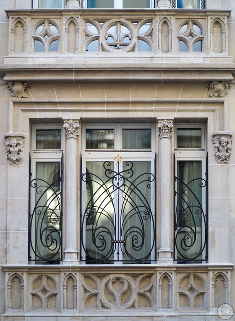 Revert de l’hôtel du même architecte, rue Eugène-Flachat. La polychromie y est encore plus présente, la façade est agrémentée d’un bow-window à la riche ornementation florale.